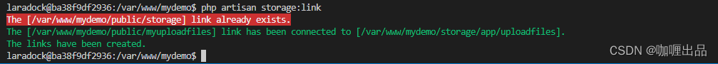 当然你也可以像我一样自定义一个软链接,如 myuploadfiles 来指定你自己存放文件的路径,要记得在填写完配置文件后,要再次运行 php artisan storage:link 命令才能生效,不过如果之前已经生成软链接的路径,在命令运行结束后会提示你软链接的路径已存在,需要注意,如下图: