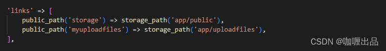 此时对于文件列表的展示,文件的上传和下载功能已完成,我们再尝试一个在页面展示一张已上传的图片,这里就需要了解一个概念,叫软链接。因为 storage 文件夹虽然用于存储文件,但是这个文件夹是不对外公开的,所以如果你想要通过文件的地址来指向具体文件来展示在页面,会提示 404 找不到文件。这里我们需要通过软链接将这个不对外公开的文件夹跟一个公开的文件夹链接,通过指向公开文件夹的路径来找到其指定的文件,这个公开的文件夹就是 public 文件夹,下面我们来讲解一下如何进行软链接操作,首先打开文件配置文件 config\filesystems.php,在最下方找到软链接的配置,如下图: