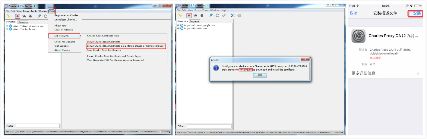 在手机自带的系统浏览器输入地址chls.pro/ssl,出现证书安装页面,点击安装,手机设置有密码的输入密码进行安装。安装完证书后,就可以截取手机上的 Https 通讯内容了。不过同样需要注意,默认情况下 Charles 并不做截取,你还需要在要截取的网络请求上右击,选择 SSL proxy 菜单项。