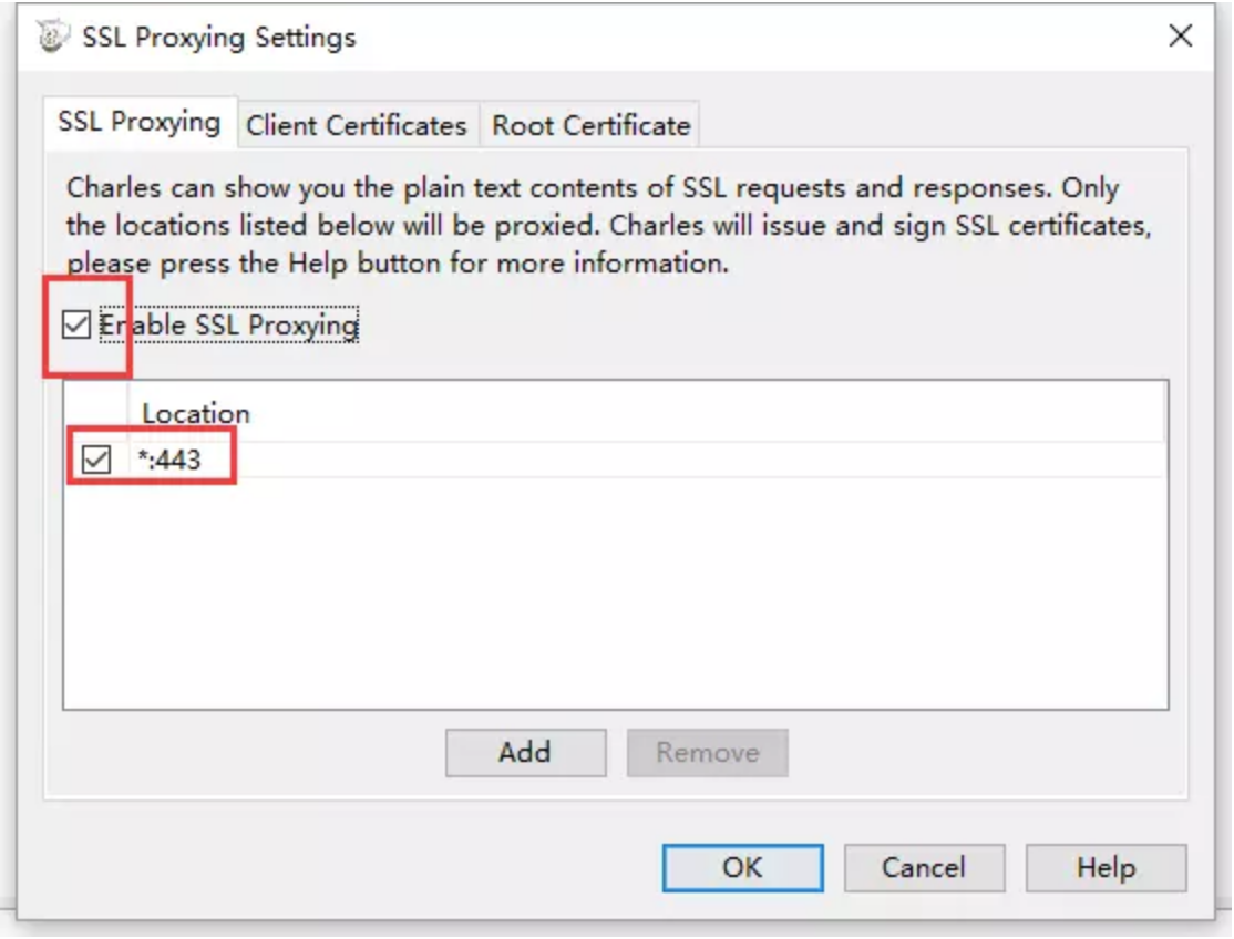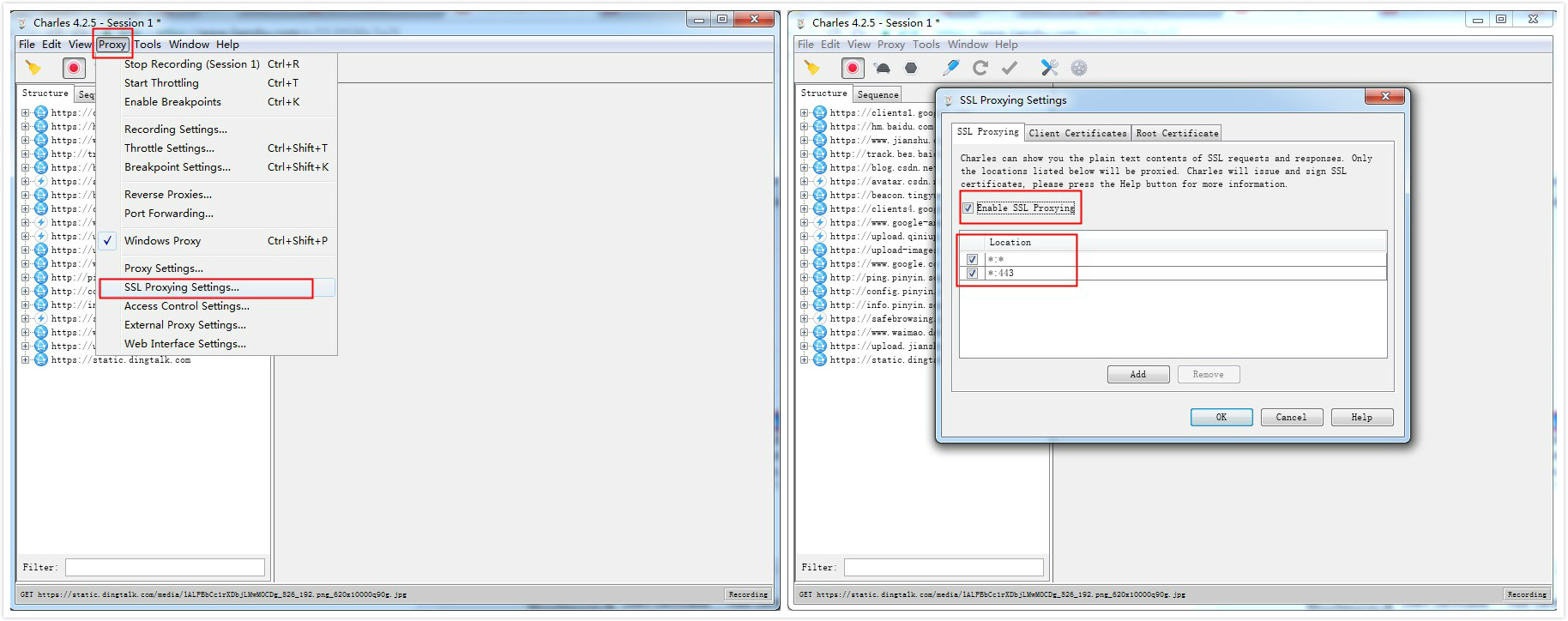 Proxy -> SSL Proxying Settings... 勾选Enable SSL Proxying,点击Add,点击Add,Host设置要抓取的https接口,