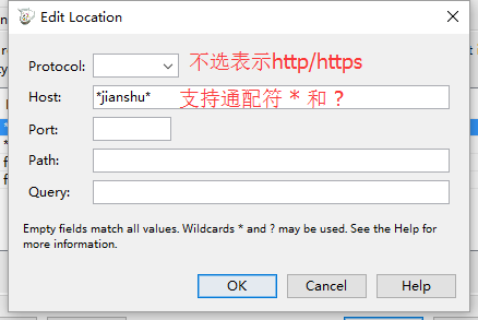 比较好用的是过滤条件支持通配符,*表示任意多个字符,?表示一个字符,如Protocol中有http,https和 "",选择空白或者输入*都可以表示任意协议的请求;