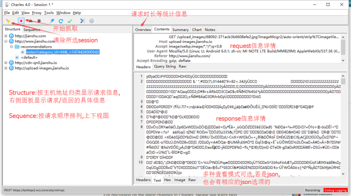 主要是会话的两种视图模式以及对应的 requet/response 面板组成: