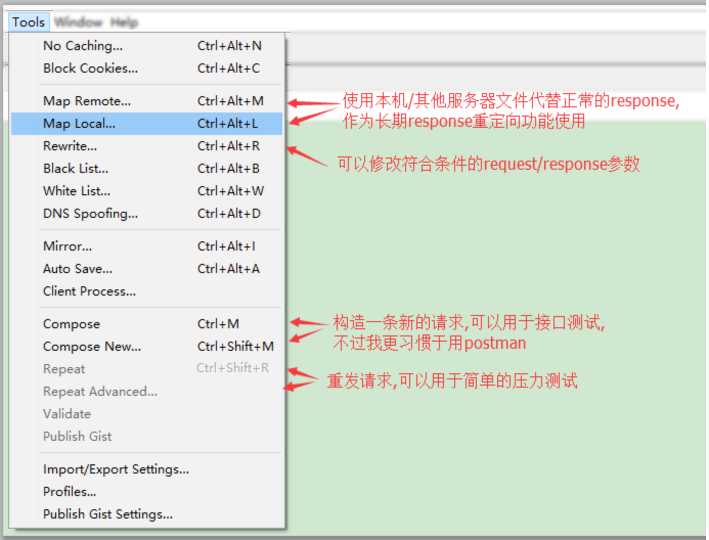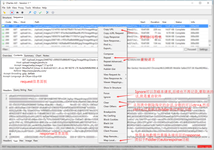 常用的功能在图上已经有注释,不多说,感觉Chales的右键功能比Fiddler多一点,简单看几个: