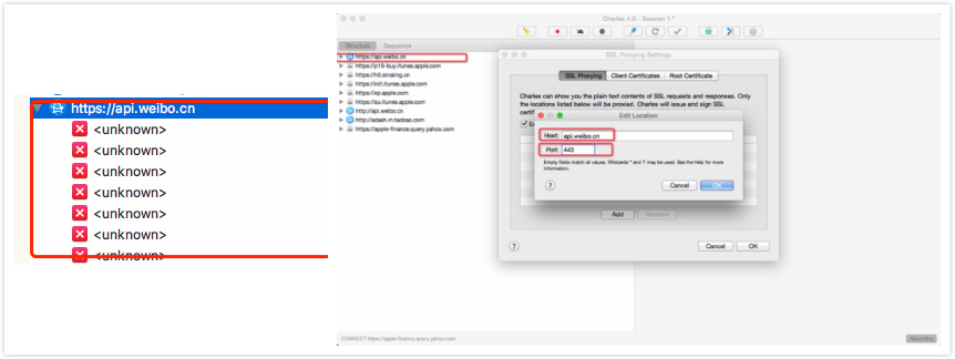 设置前抓包HTTPS接口显示unknown(图左),设置后接口正常展示,如下图右