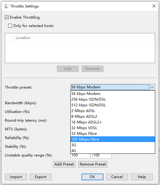 在这里选择要模拟的网络环境,选项比Fidder多很多,也可以自定义,最人性的还可以对指定的url进行网络环境摸, 好评...