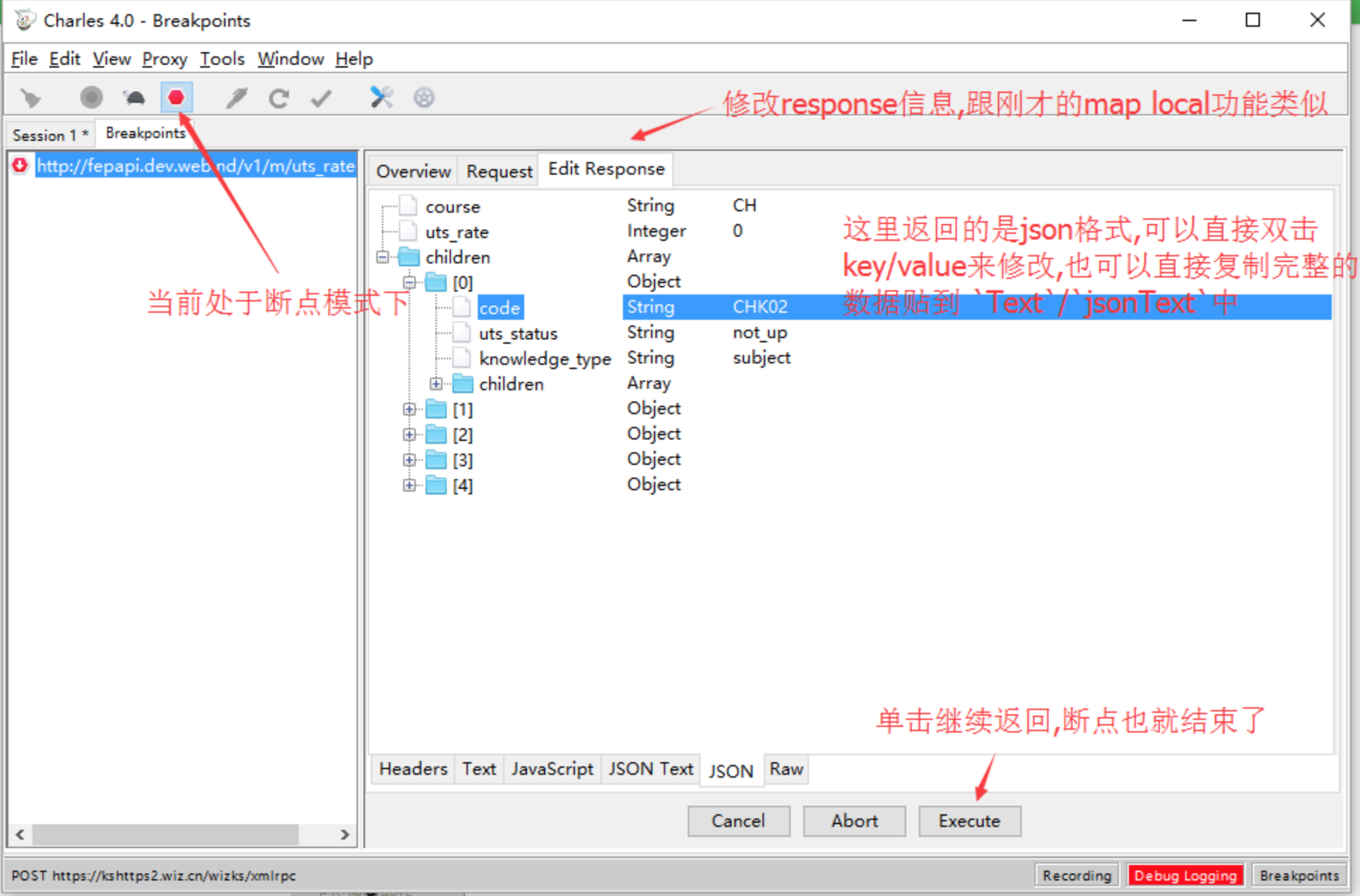 在edit response中可以双击直接修改json文件的key/value值,很方便,修改完成后单击execute继续执行其他操作,将修改后的response返回给客户端;