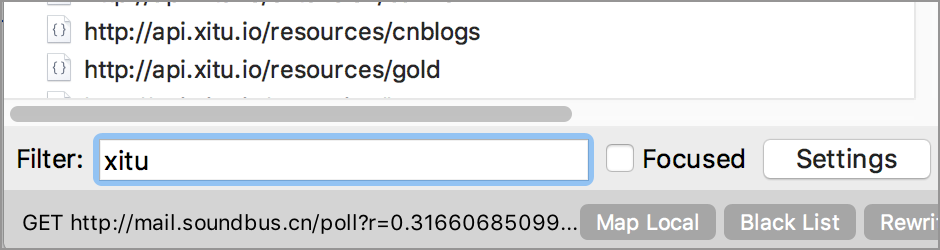 还有一种方法就是在一个网址上右击,选择Focus,然后其他的请求就会被放到一个叫Other Host的文件夹里面,这样也达到了过滤的目的。
