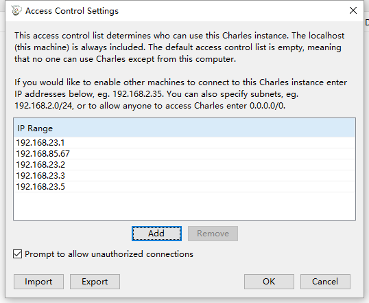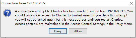 以上设定完成后,就可以charles中捕获手机请求了,第一次连接的时候charles会弹出确认提示框,选择 allow 就好了,后续可在 proxy -> access control settings 中进行管理: