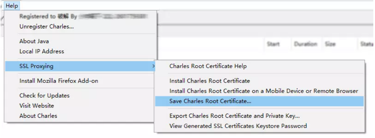 Help -> SSL proxying -> Install charles root certificate on a Mobile Device or remote browser…