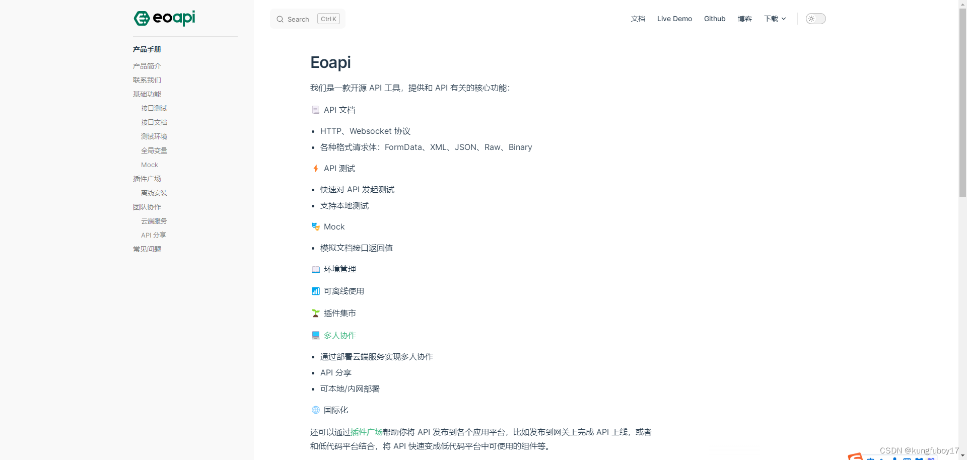 这类 API 管理工具,除了 API 文档功能,有的还可以进行 mock 测试、团队协作等功能,特别方便前后端对接时使用,今天给大家带来一个新的开源 API 管理工具——Eoapi(现更名为 Postcat)。