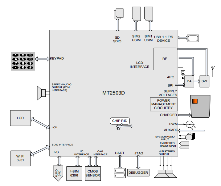 MT2503D是一种基于低功耗CMOS工艺的集成前沿电源管理单元、模拟基带和无线电电路的单片芯片。