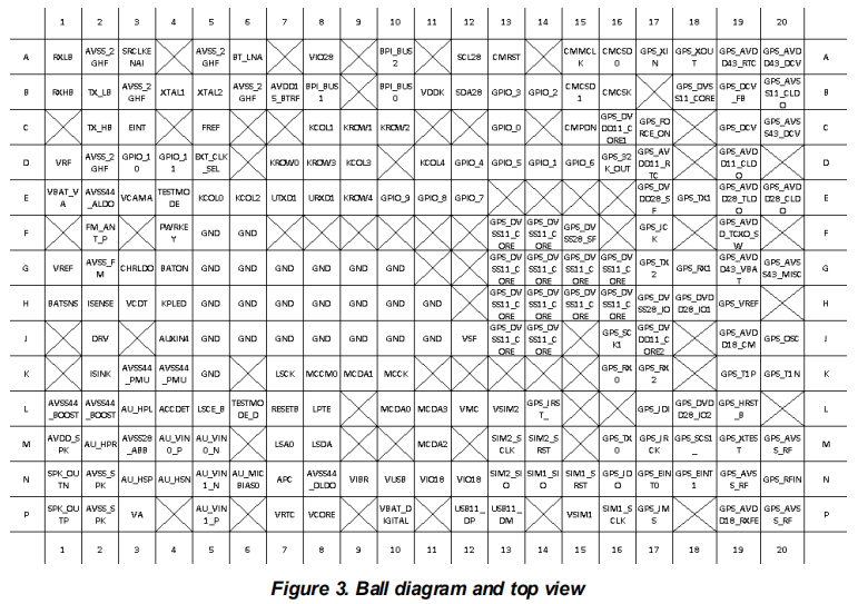 对于MT2503D,一个TFBGA 8.4mm*6.2mm,215-球,0.4mm螺距包提供。图3给出了这个包的引脚和顶部视图。