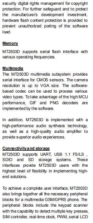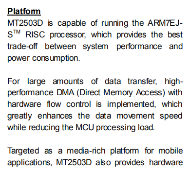 MT2503D是一个功能丰富和功能非常强大的单芯片解决方案,用于高端GSM/GPRS能力。基于32位ARM7EJ-STMRISC处理器,MT2503D的卓越处理能力 h高带宽架构和专用硬件支持,为高性能GPRS 12级调制解调器应用和前沿多媒体应用提供了平台。