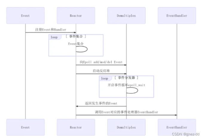 将事件注册到Reactor上,Reactor会向事件分发器添加对应的事件,事件分发器进行监听,如果事件发生时会告诉Reactor,由Reactor调用相应的事件处理器