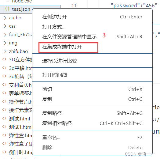 (5)重新打开VScode,选中json文件右击打开“在集成终端中打开” ;然后下面显示终端:
