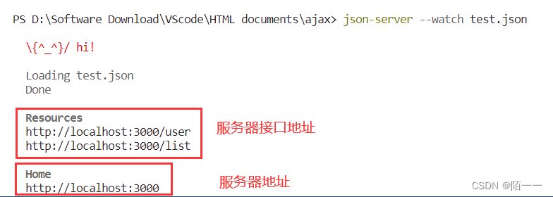 json-server --watch test.json- 注意:test.json是你自己创建的json文件,这里要换成你自己的文件名;