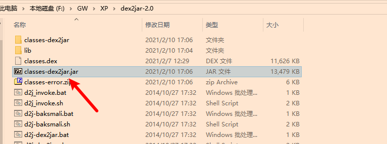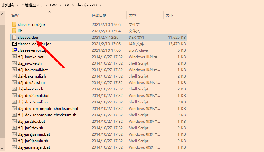 把解压得到的classes.dex文件放入dex2jar.bat所在目录