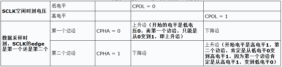 CPOL和CPHA,分别都可以是0或时1,对应的四种组合就是: