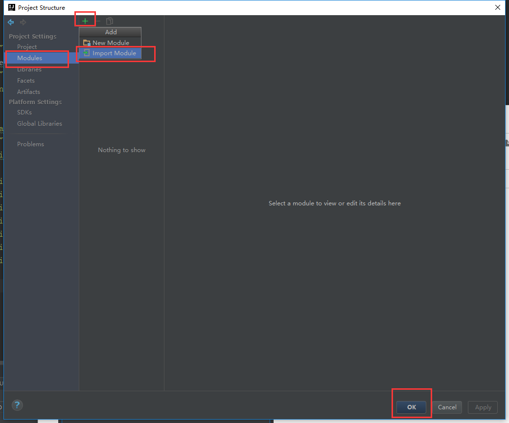 6.选择【Modules】→ 点击【+】号 →选择【Import Module】→ 弹出添加项目的窗口,选择你需要添加的项目,点击ok (这一步就是在往项目空间里添加项目)