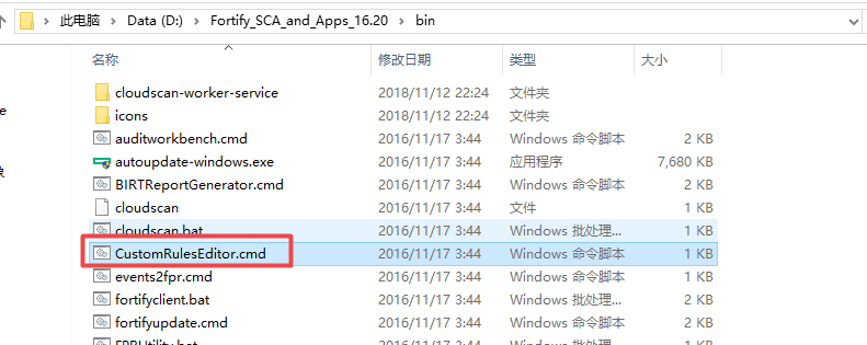 1). 在fortify SCA安装的bin目录下找到打开自定义规则编辑器,CustomRulesEditor.cmd,如下图所示: