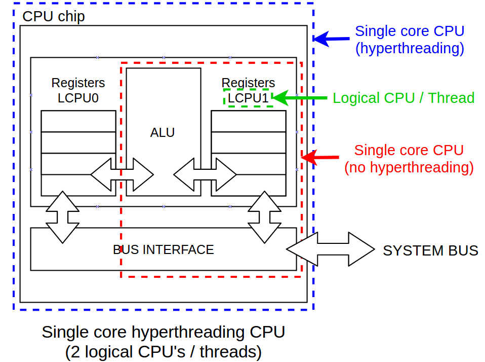 为了应对上面提到的问题,发明了超线程技术(HyperThreading), 超线程的原理是在同一个cpu芯片内部有些内部组件会存在多份,比如 寄存器或者一级缓存,这样同一个cpu就可以用来执行多个线程或者进程,并且它们之间的通信是在cpu内部,不会造成因为要经由系统总线通信而造成的性能瓶颈。如果一个进程因为等待一个中断而阻塞,那另一个进程就可以继续使用这个cpu来计算(注: 所以实际上超线程并不能真正意义上实现并行)。