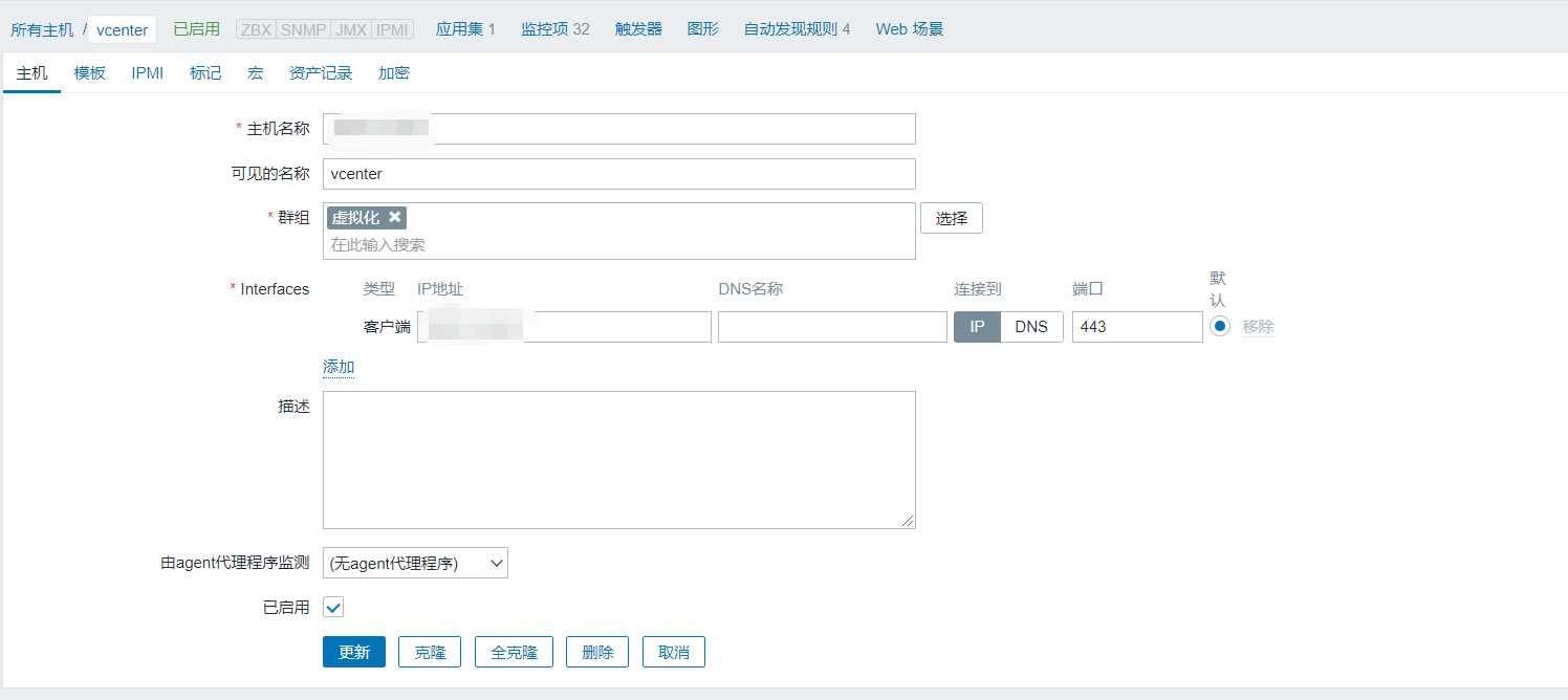 登录后,点击要监控的服务器,配置--->高级配置,下滑查找VirtualCenter.VimApiUrl配置的值,即为{$VMWARE.URL}宏的值。