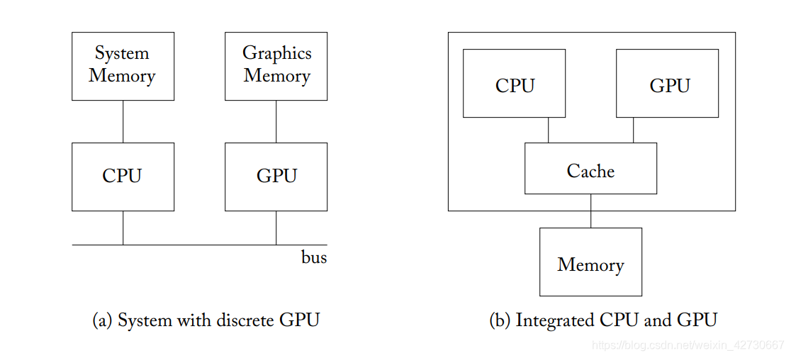 上述情况出现在CPU和GPU分离状况(discrete GPU)即 GPU和 CPU不在一个芯片中,而在集成的GPU中即CPU和GPU集成在一个芯片中例如AMD APU芯片,由于两个芯片被集成到一个芯片内,其内存类型一般采用DRAM,低延迟类型芯片,因为CPU和GPU之间的内存不需要来回进行传输拷贝。