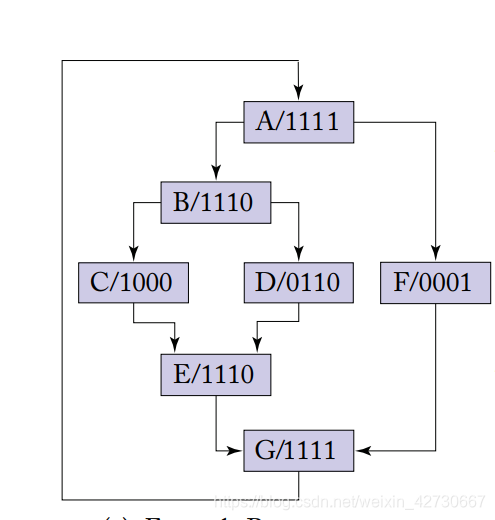 为了解决上述分支情况,SIMT stack模块使用mask来进行标记,其中置为1表示该线程需要执行,置0表示该线程不需要执行,每一个bit位代表了一个线程。假设一个GPU,warp大小为4 即同时支持4个线程并行运行,当上述kernel代码运行到A处时,所有的线程都运行,则标记位”A/1111“,其中mask bit位从低位到高位分别表示四个线程从第一个到第四个线程。当代码运行到if(t3 != t4) 时出现分支造成线程分化,其中第四个线程运行F分支,第一到三个线程运行B分支,则可分别表示"F/0001"和”B/1110"。处于B线程继续执行又遇到if( t5 != t4 )分支,其中第一个线程执行C,第二和三个线程执行D,mask可分别表示位"C/1000"和"D/0110",当C和D执行完毕之后到E线程有重新聚合,即"E/1110"。而在G出 又出现了线程聚合,即"G/1111"。整个上述kernel执行控制流图(control flow graph)CFG,如下图所示: