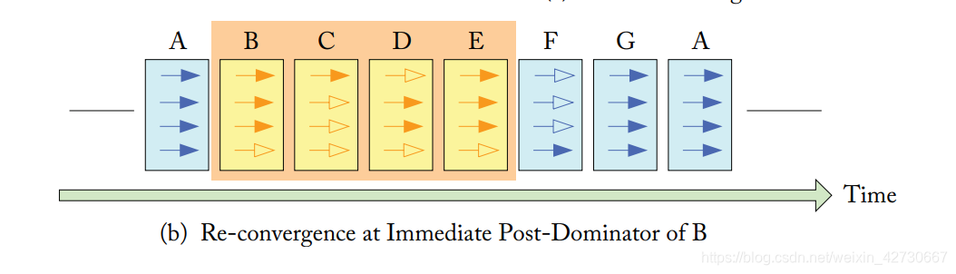 上述SIMT stack中在初始化c图部分,TOS指向下一个Next PC为B,即下一个要执行的指令为B出现分支,执行B指令的mask为1110。而B 指令的entry指向 d图的TOS,即指向完B之后 开始执行C 执行而B执行聚合点指令为E,即执行完C之后之后还要执行聚合点同样为E的指令 即D指令,只有聚合点都是E的指令执行完毕之后,才能进行往下执行,而 执行的指令则为E指令。此时同样E指令的聚合点指令为G,需要把所有聚合点位G的指令执行完毕之后 才能执行G 指令。