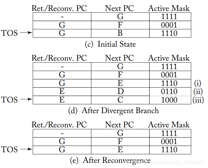 其中每个entry有三项分别为 reconvergence program counter(RPC或者Ret/Reconv PC,聚合点PC)、the address of the next instruction to execute(Next PC 要执行的下一条PC)、Active Mask(记录当前指令哪些线程执行,哪些线程被屏蔽),其中 TOS 即为 top of stack处于栈顶位置,指向的当前指令对应的entry,上述i 和ii 以及iii分别代表三个分支的entry。每个entry中如果Next PC 和Ret/Reconv PC不相等则说明存在分支情况(注意这是个人看法,暂时还没有从相关论文中找到这个明确说法)。