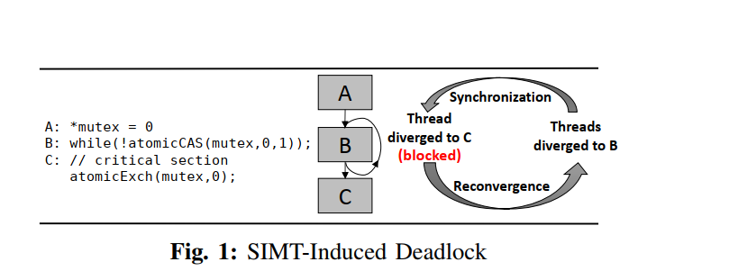 Ahmed ElTantawy and Tor M. Aamodt等人在《MIMD Synchronization on SIMT Architectures》论文中明确指出了天生的deadlock问题,该论证中使用的模型如下: