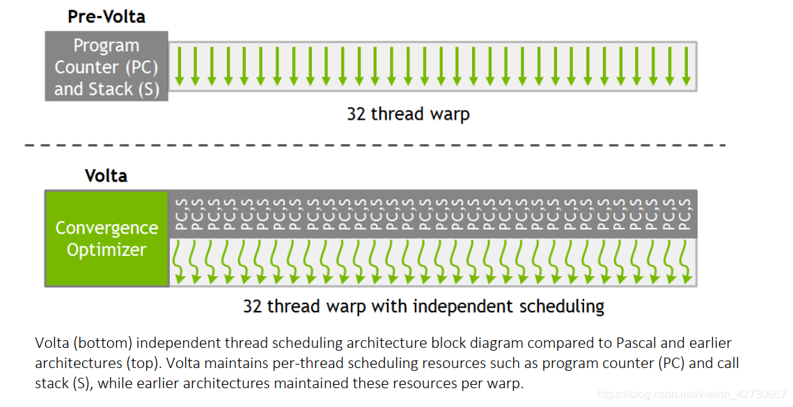 V100 中NV 为warp内每个线程都分配了一个PC指针和Stack,这样将PC指针的颗粒度细化到了每一个线程中去,但是这样就于GPU 的根基SIMT执行模型又有明显的冲突,因为这样每个线程都有自己的PC,岂不是和CPU没什么本质上的差别。为了解决上述问题,在V100内部调用中,硬件还是使用的warp这一单位进行调度线程,V100内部中使用了a schedule optimizer硬件模块决定哪些线程可以在一个warp内进行调度(这样就涉及到另外一种技术rearrange thread 稍后再讲),讲相同的指令重新进行组织排布到一个warp内,执行SIMD模型,以保证最大利用效率。下面为V100白皮书中的原话: