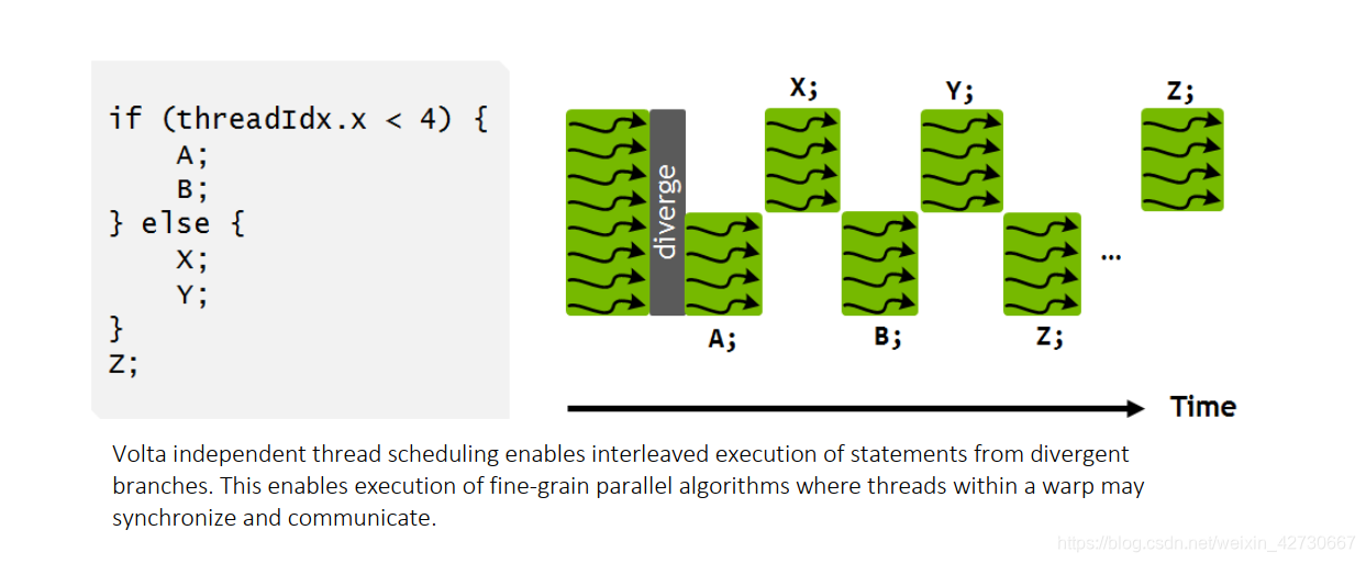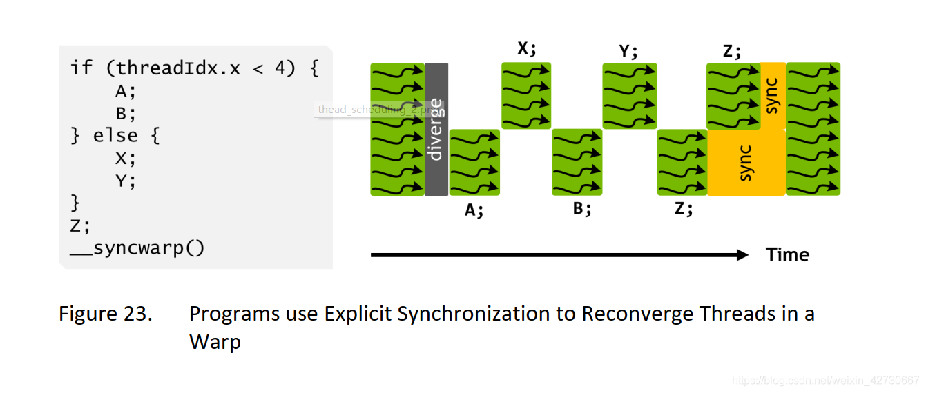 上述例子为V100中官方例子,其中有两个分支A和B ,X和Y,warp按照串行执行两个分支。上图中有一个明显改进就是 执行A之外 可以切换到执行X,这样做的好处可以隐藏A内存操作延迟,这样交替执行更能提高硬件利用率。同时也可以发现两个分支的聚合点Z,并没有等待所有分支执行完毕之后再一起聚合执行,这是因为无法识别到Z是否依赖各自的结果,所以只能各自执行以便提高效率。如果有些算法需要聚合之后再同步执行Z,NV提供了另外一个函数__syncwarp(),可以是Z之后的代码进行聚合执行,如下提u所示: