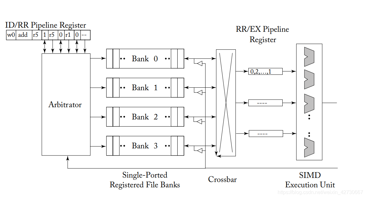 上图为operand collector原型图,该图中拥有4个bank 通过crossbar链接链接到 Pipleline Register,pipleline Register 为stage register,用于临时存储从regiester file读取过来的指令/数据,stage register最后将得到的数据/指令发送到SIMD执行单元中。