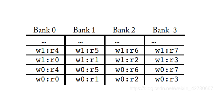 上图一个寄存器一个为4个bank的布局,其中r0表示的是r0寄存器, w0代表warp 0,那么w0:r0代表来自于w0的r0寄存器分布在bank0中,来自于w0的r1寄存器分布在bank1中,依次进行排布,当寄存器的数量大于bank时,那边将轮转重新排布,即w:r4排布到bank 0寄存器中。依次w1:r0重新从bank0开始排布。那边如果在一个warp0和wapr1中如果warp 0读取的是r0寄存器 warp1读取的是r1寄存器,分布到两个不同的bank内,即可以同时进去读取。如果是warp0和warp读取 r0寄存器那么将会产生一个bank冲突,造成无法并行,bank冲突会严重影响性能。下面有个例子将会说明bank冲突将会怎样影响性能调度
