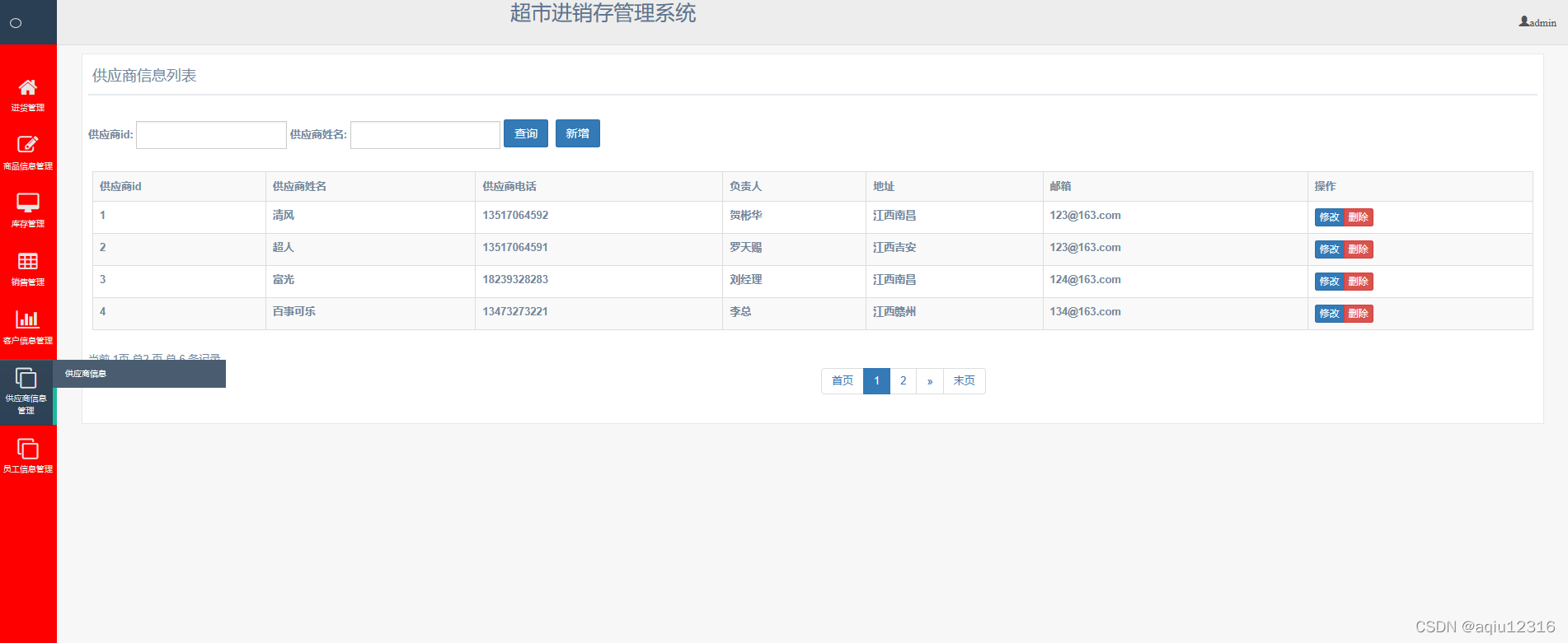 (6)供应商管理:用户可以在该模块中进行供应商信息添加,供应商信息查看,供应商信息修改以及供应商信息查看操作。