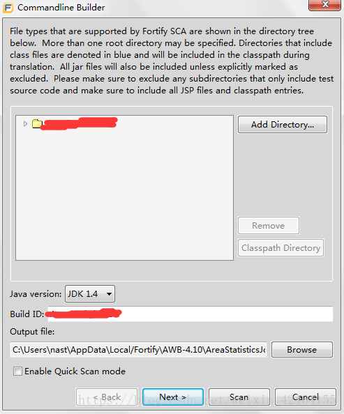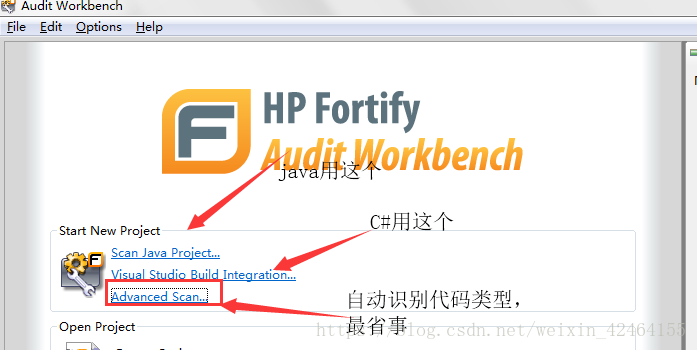 打开fortify的工作台,选择Advanced Scan(如果你知道源代码是java的可以选择Scan Java,C#可以选择Scan VS,不知道的话就选Advanced Scan)