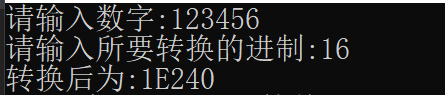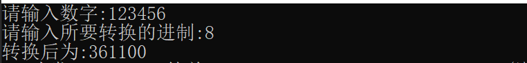 {char arr[100];int n;char* p = arr;printf("请输入数字:");scanf("%d", &n);int rax;printf("请输入所要转换的进制:");scanf("%d", &rax);Myitoar(p, n, rax);/*for (; *p != '\0'; p++){printf("%c",*p);}*/printf("转换后为:");printf("%s", p);return 0;