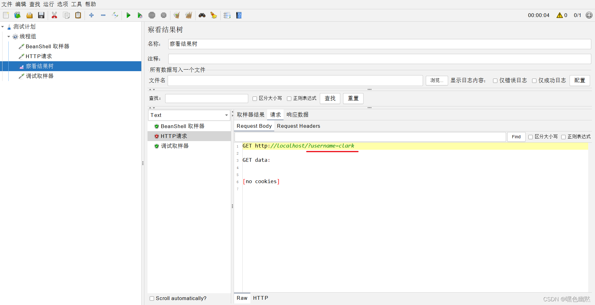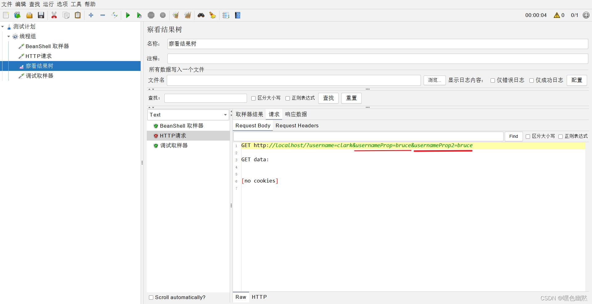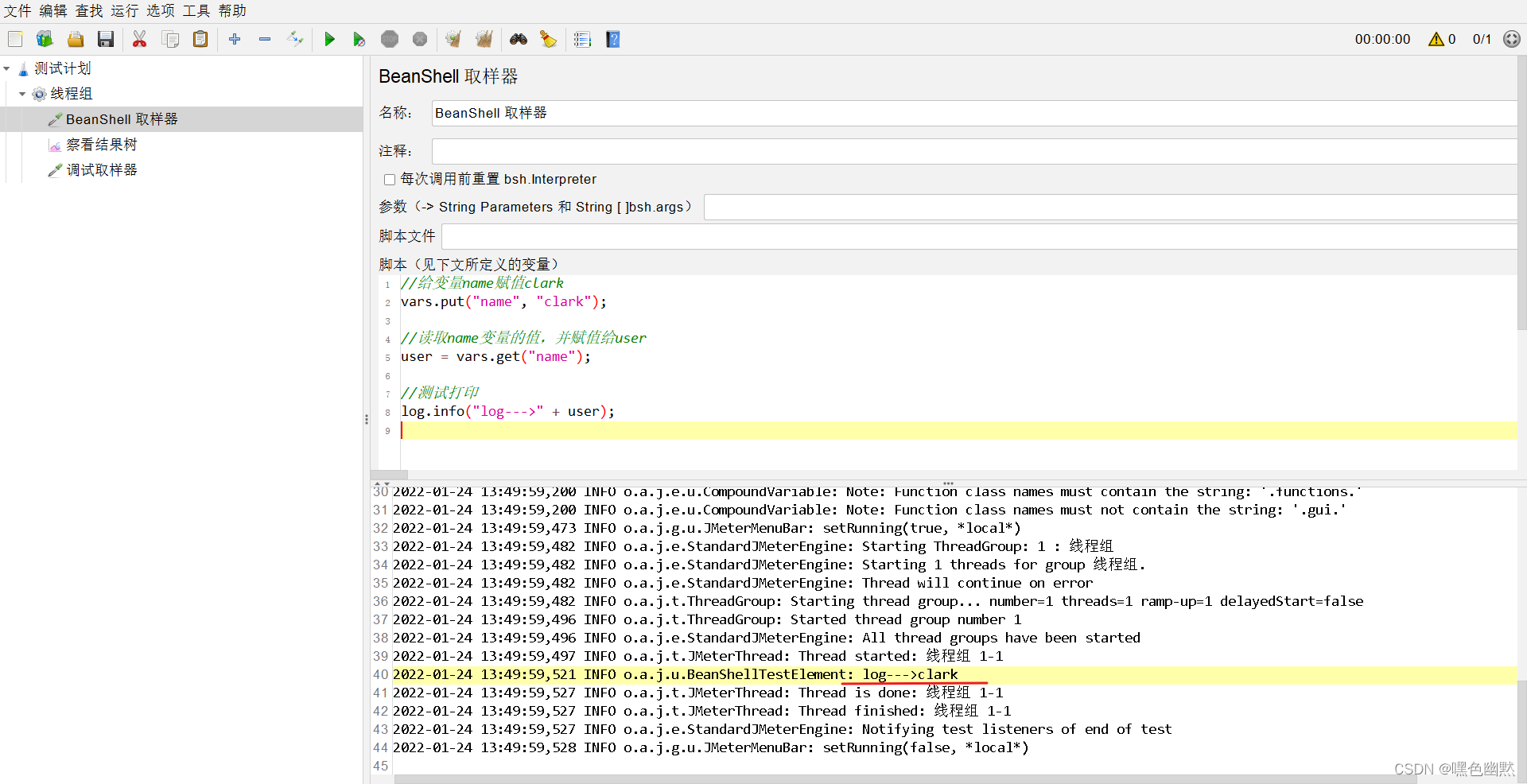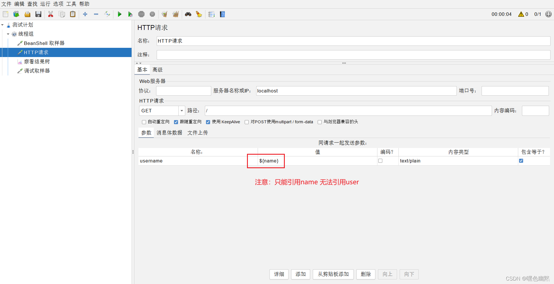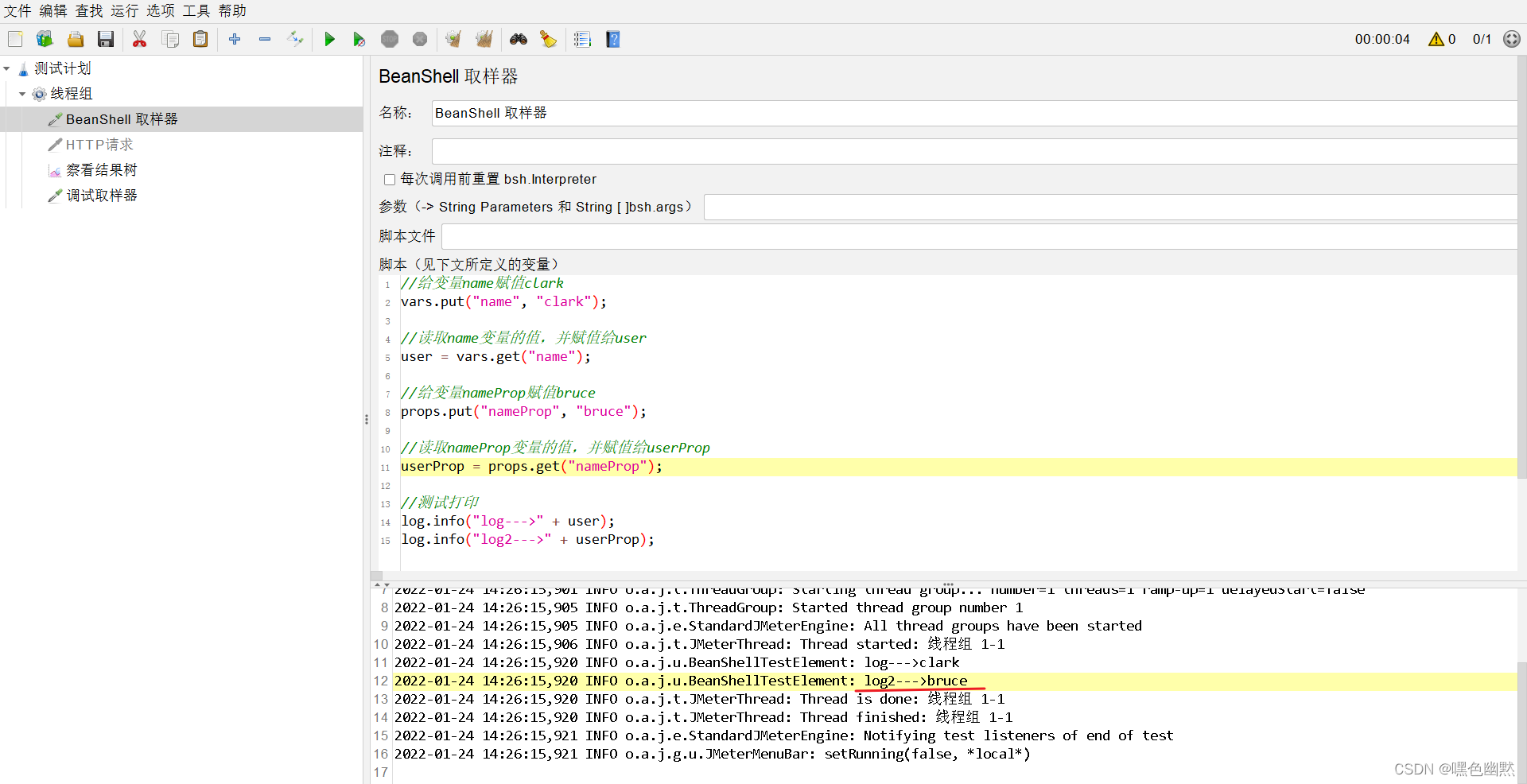 - 注意:此时HTTP请求和BeanShell取样器须在同一个线程组内。
