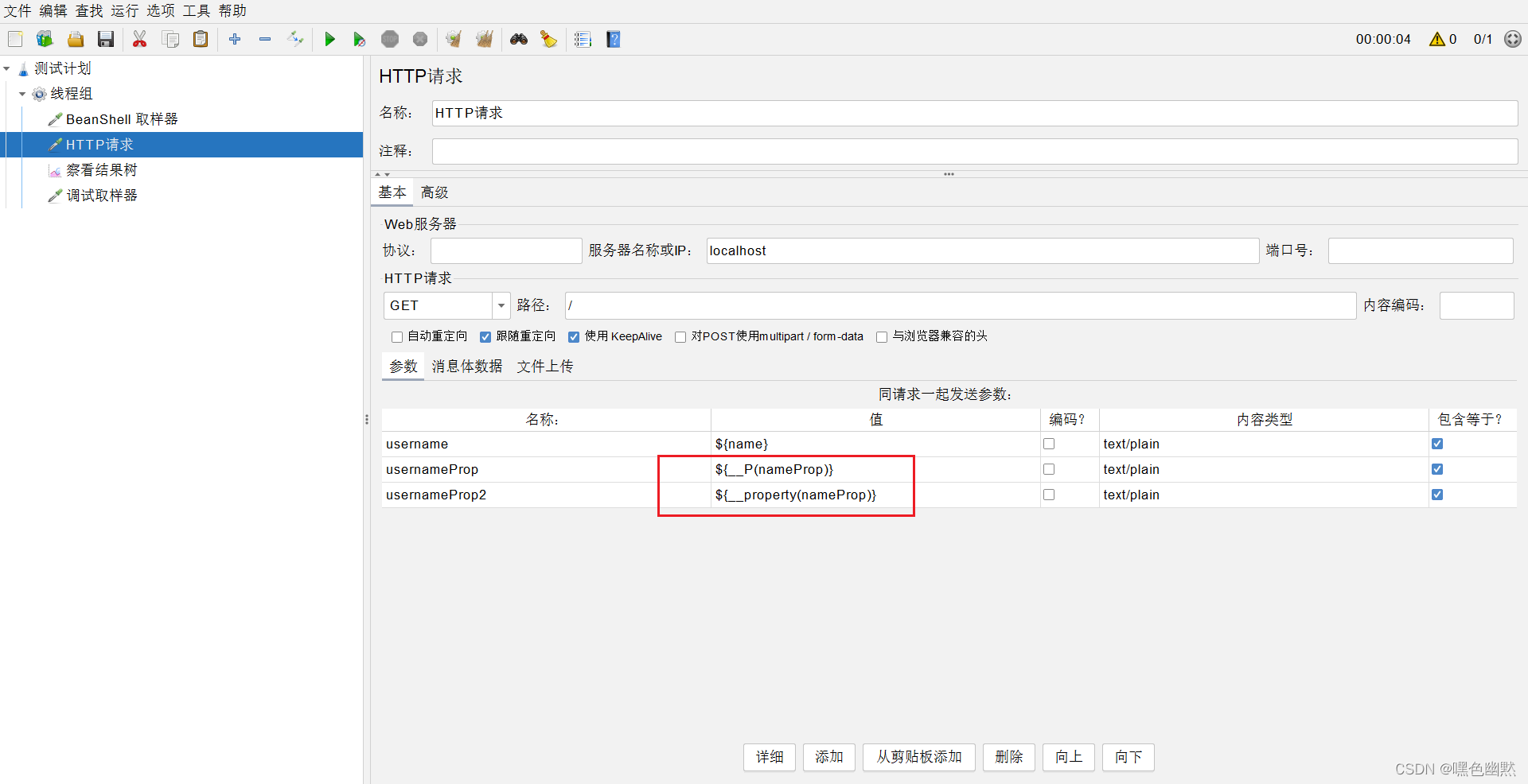 - BeanShell函数 是创建了一个小型的java环境,可以直接执行一些简单的表达式,如:${__BeanShell(props.get("nameProp"),)}