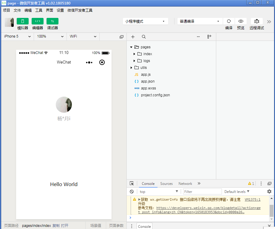 4.app.js(交互逻辑)响应用户的点击、获取用户的位置等等。在小程序里边,我们就通过编写 JS 脚本文件来处理用户的操作。本js中写的是获取微信的头像,显示信息(hello word!)以及点击它们时所触发的事件,代码如下:
