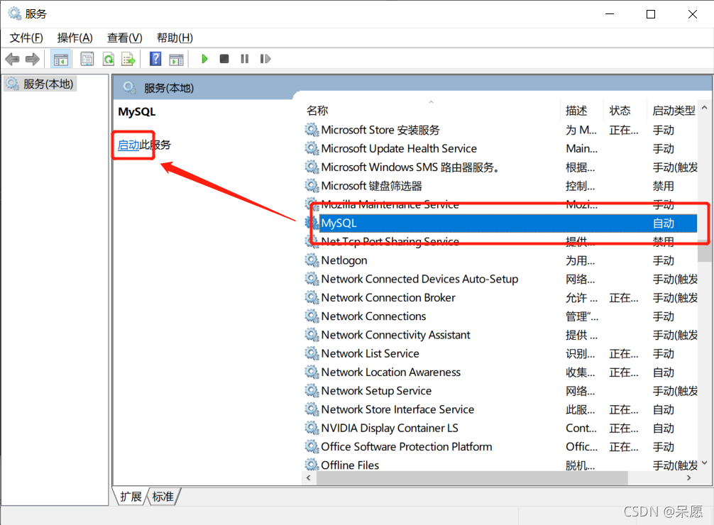 咳咳,这个容易,点击右键或者点击下图红色箭头所示的按钮启动 MySQL 服务即可。