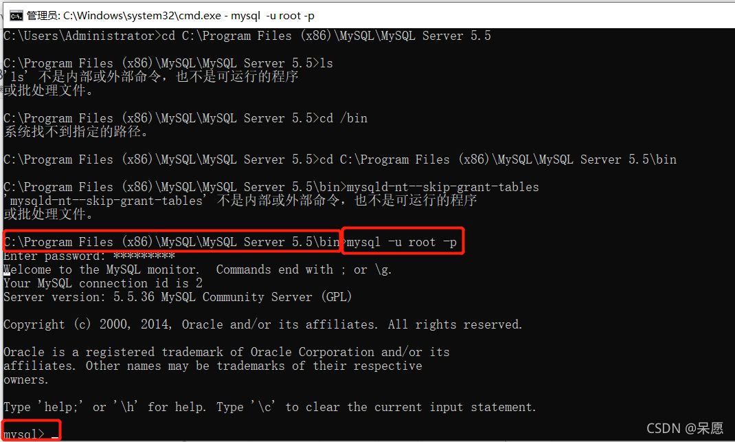 方法 2:找出运行win+R,在cmd中,cd到MySQL Server X.X的bin目录下,然后输入mysql -u root -p命令,再输入密码,即可。