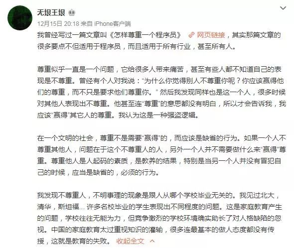 纵观华语互联网历史,好像还没有人能在diss王垠之后全身而退,看来又成事实。按照王垠的性格,肯定少不了再次回复的,我们吃瓜继续。