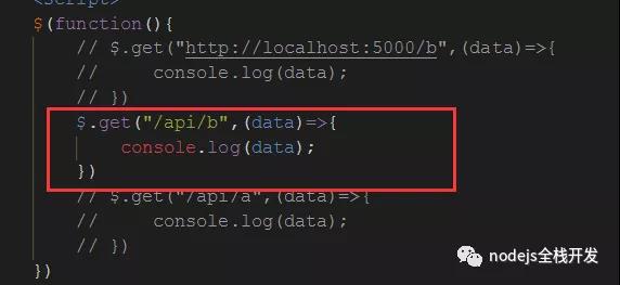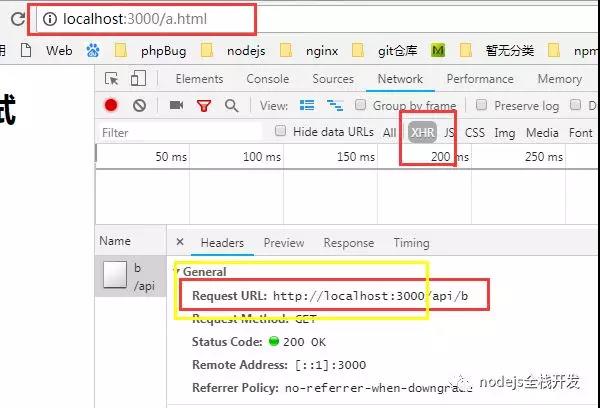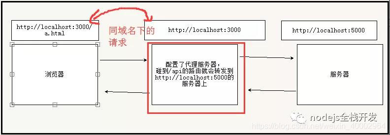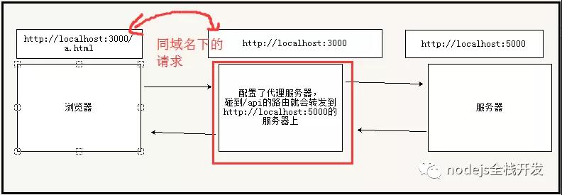 成功跨域了,当然这样说不严谨,浏览器并没有参与跨域,而是页面中的ajax请求的地址还是3000端口的服务,只不过是3000端口的服务接收到请求,将其转发给了5000端口的服务,并将5000端口的服务结果原封不动的返还给了浏览器。
