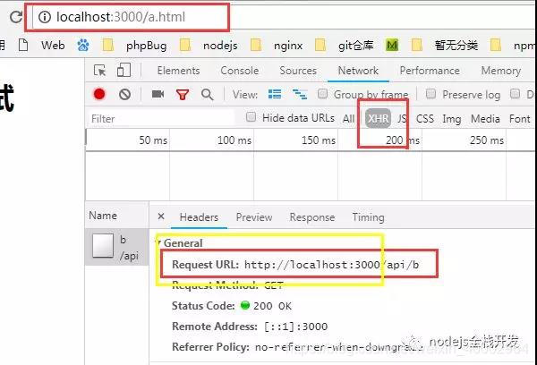 此时启动静态资源服务器和接口服务器,然后访问静态资源服务器下面的a.html,结果如图: