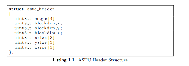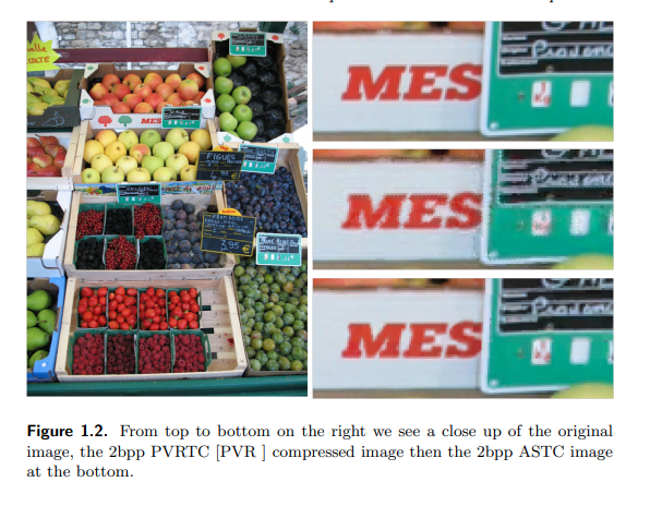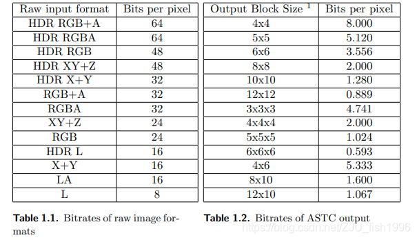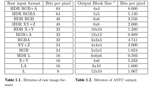 ASTC的核心基础是它可以压缩每种(表1.1)常用格式的输入图像,并以用户选择的任何比特率输出该图像,从8bpp到0.89bpp。如果是3D纹理,则为0.49bpp(表1.2)。