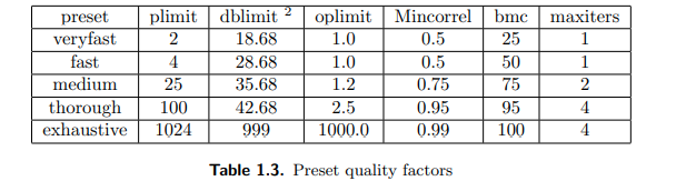 我们通常会使用一些质量预设作为默认设置,如表1.3所示,利用这些参数设置可以在质量和压缩时间之间寻求一个平衡。搜索的限制越大,算法接受当前块为“足够好”的块的“意愿”就越低,花更多的时间找到更好的匹配,不过还有另一种获得更好匹配结果的方法,那就是调整质量指标,改变压缩器判断块质量的因子。