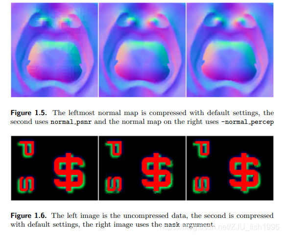 前两种设置针对2通道压缩的法线,它将x和y转换为亮度和alpha,覆盖默认的oplimit和mincorrel,并增加角度误差的权重,这在法线贴图中更为重要。-normal percep参数比较类似,但权重略有不同,是为了获得更好的感知结果。这些可在图1.5中看到。