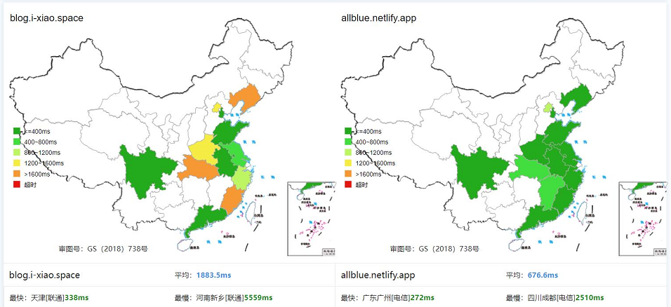 下图展示GitHub Pages站点和Netlify站点的全国网速对比(数据来源站长工具)